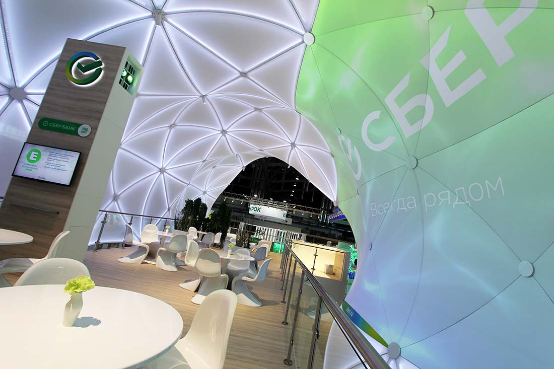 Студией Дега был спроектирован и построен двухэтажный выставочный стенд СБЕРБАНК на выставке Иннопром-2021 в Екатеринбурге. На первом этаже площадью 250 м2 были размещены демонстрационные зоны сервисов компании, зона подписаний, переговорные и технические комнаты. На втором этаже расположилась просторная зона VIP площадью 100 м2 с криволинейным экраном. Стенд Сбера, подобно кораблю, возвышался в выставочном пространстве павильона, притягивая внимание посетителей.